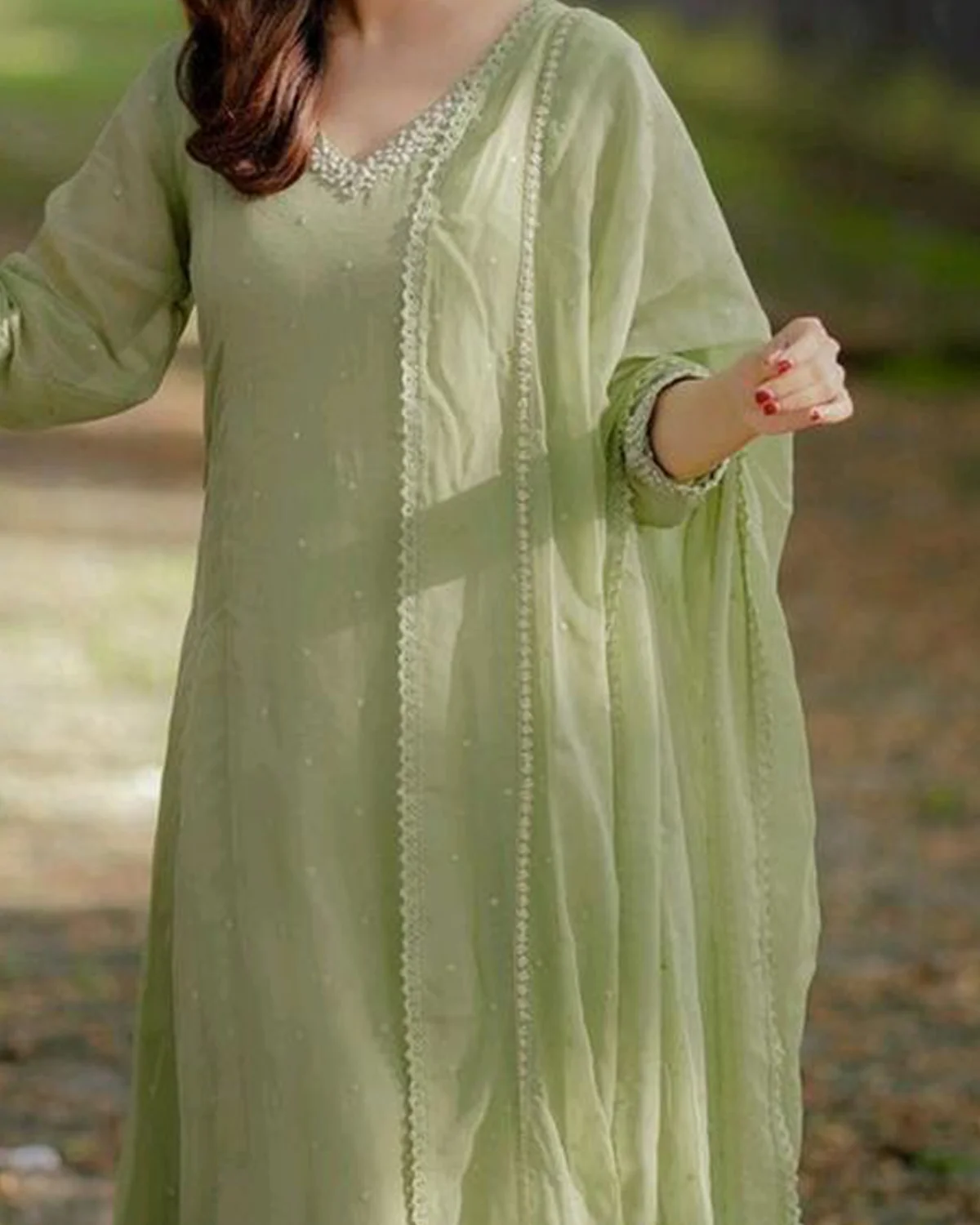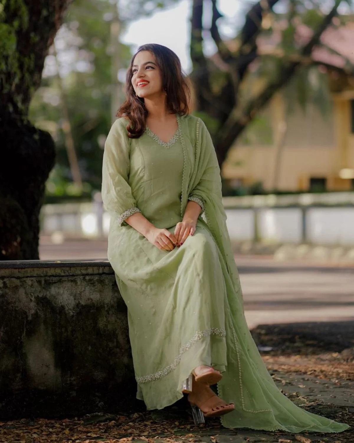 Elegant pastel green Anarkali suit with delicate embroidery, perfect for festive occasions and casual events.